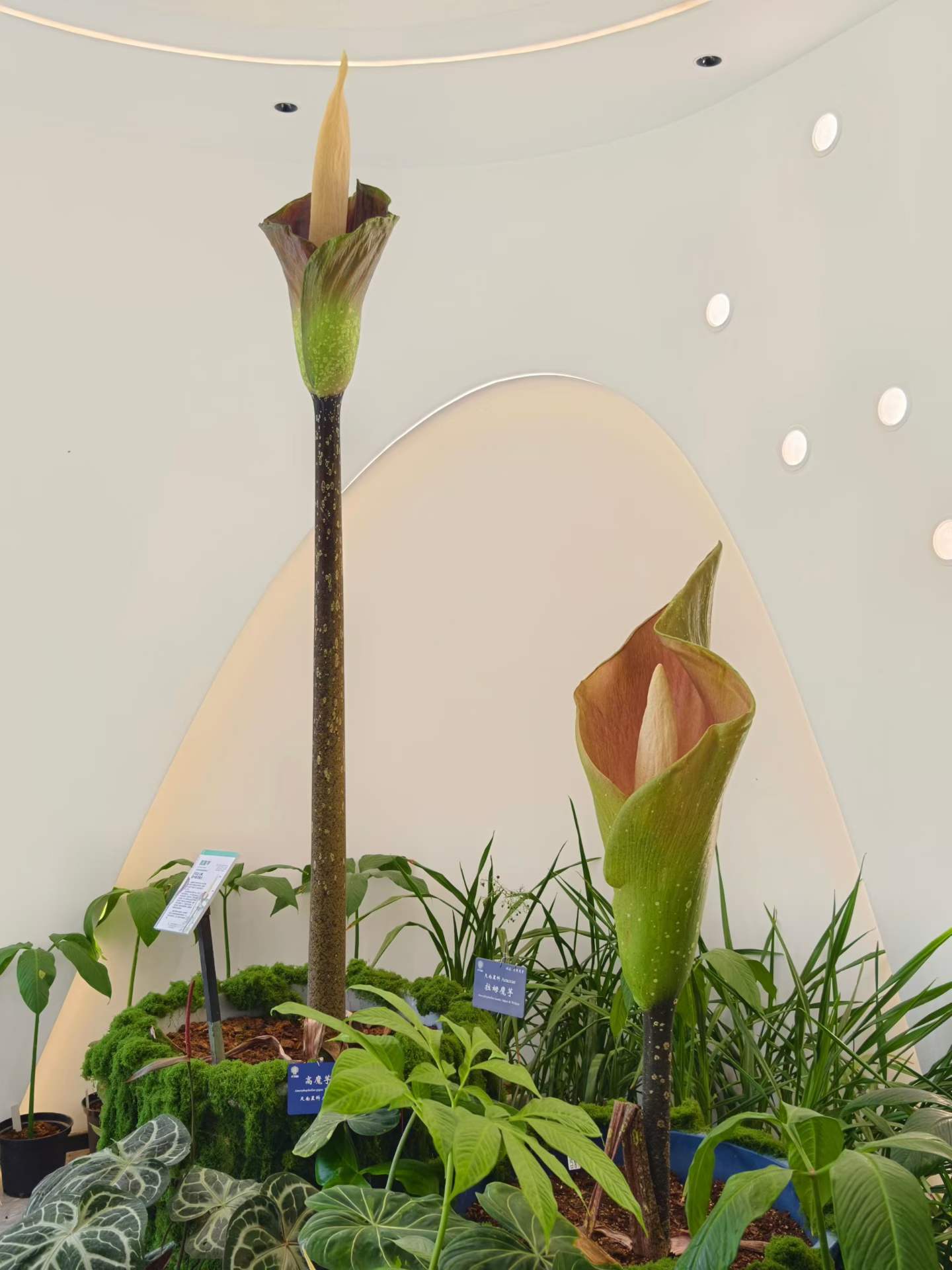 Another related species, Amorphophallus hewittii, came into bloom at the same time. Both plants reached their peak on April 18–19, offering a once-in-a-lifetime opportunity to witness two giant Amorphophallus species flowering simultaneously in a Chinese botanical garden. The two species produced inflorescences of 2.5 meters and 1.4 meters tall, respectively.